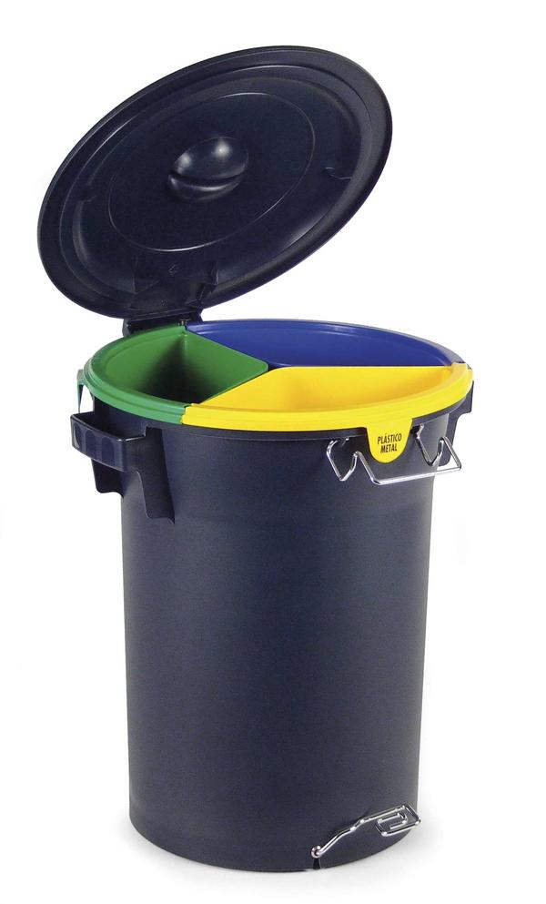 Ecoponto em formato de contentor redondo com capacidade total de 52 litros, feito em plástico resistente. Está dividido em três compartimentos de 15 litros, com as cores afetas ao tipo de reciclage...